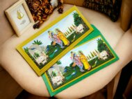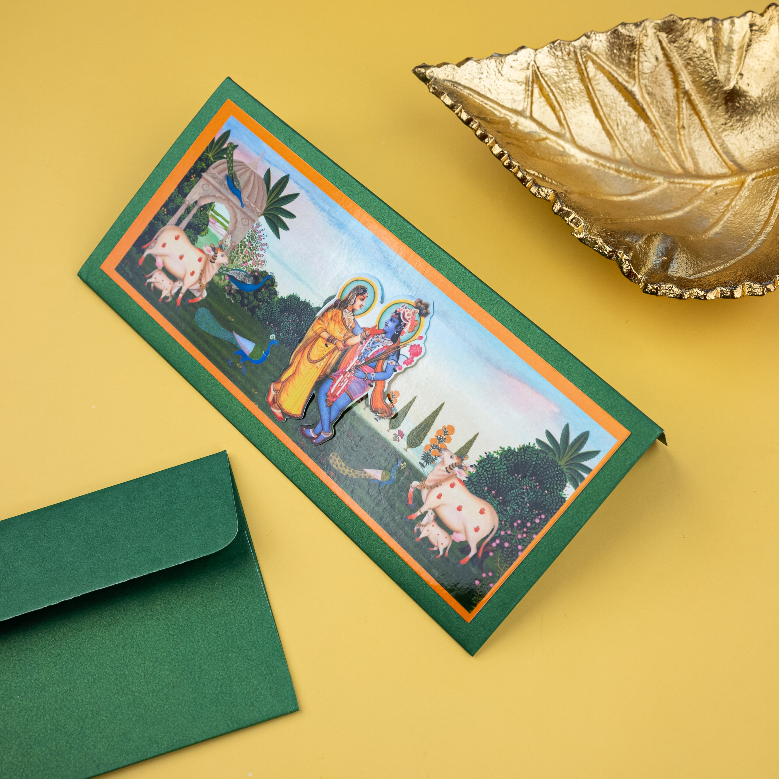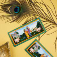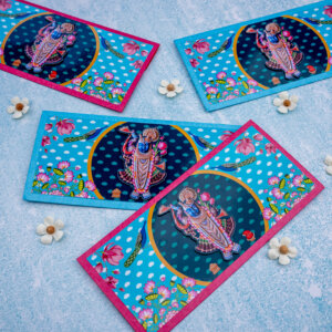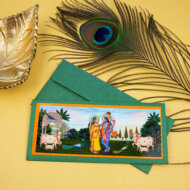 Present your offerings with deep reverence and traditional beauty. This money envelope features a classic, vibrant print of Lord Krishna and Radha in a peaceful setting, surrounded by Gaumata and natural elements. The rich green envelope and bright print create a devotional and festive mood. Ideal for Janmashtami, Pooja ceremonies, Raksha Bandhan, or any event where a blend of rich color and traditional spirituality is desired.