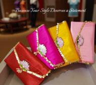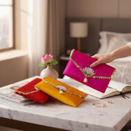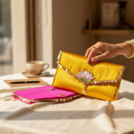 Present your gifts with bold, beautiful color and traditional flair. This exquisite collection of clutches features a vibrant, smooth silk fabric base. Each piece is adorned with a delicate lotus flower appliqué or motif and finished with a stylish border of golden sequins and white pearls. The rich colors and fine detailing make these pouches a perfect accessory for festive events or as a luxury shagun cover. Ideal for Weddings, Sangeet, Festive Gifting, or any occasion that calls for a statement accessory.