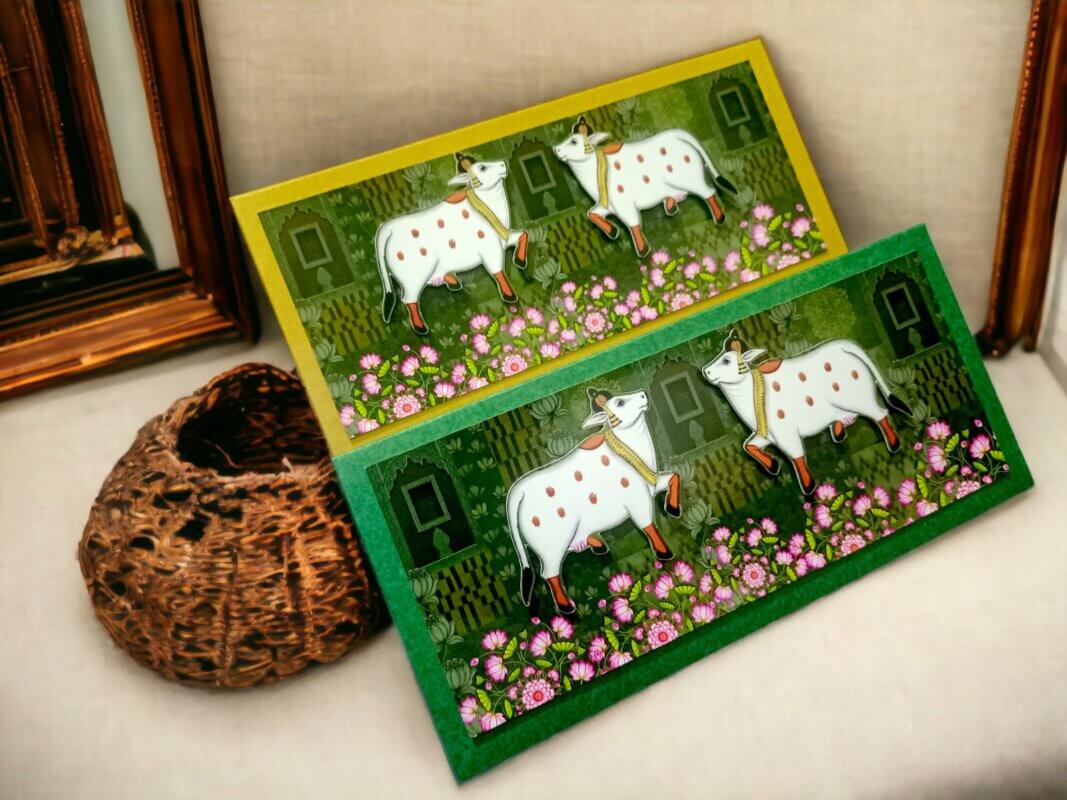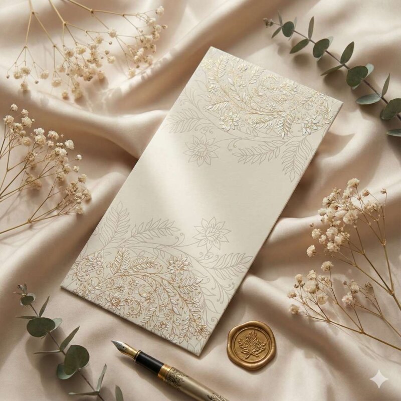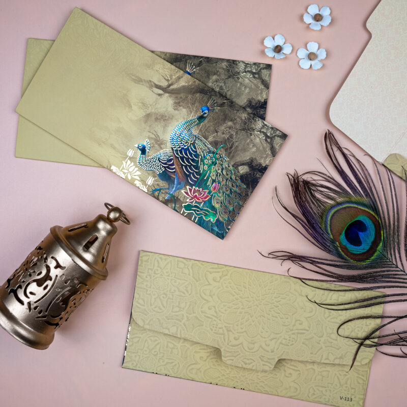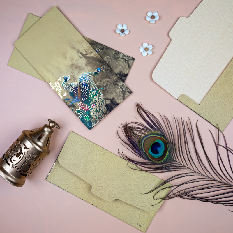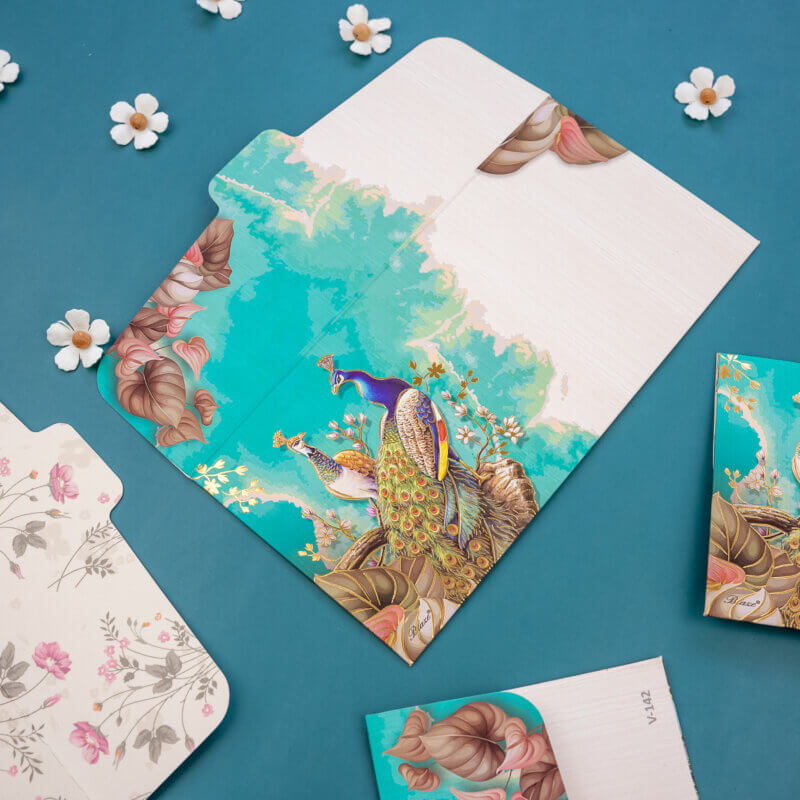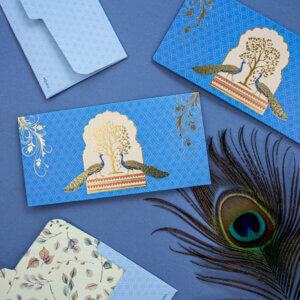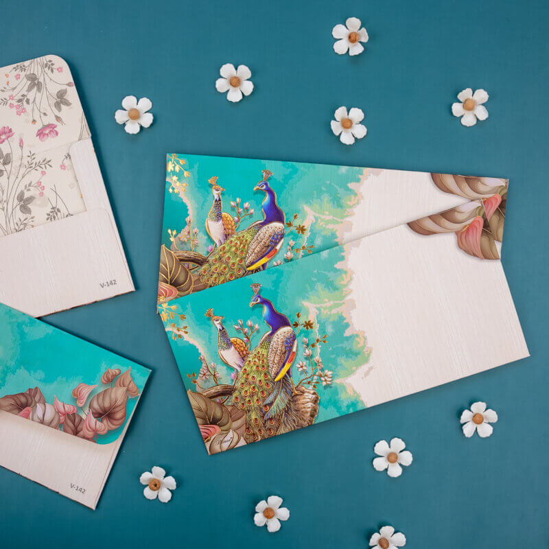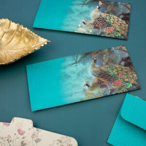 Add a splash of vibrancy to your gifting with these elegant money envelopes, adorned with stunning peacock artwork and rich floral detailing against a radiant teal background. Perfect for weddings, festivals, and other joyous occasions, these shagun lifafa envelopes combine artistic charm with cultural heritage. Crafted with premium materials and meticulous design, they offer a refined and visually striking way to present your monetary gifts, making each occasion even more special.