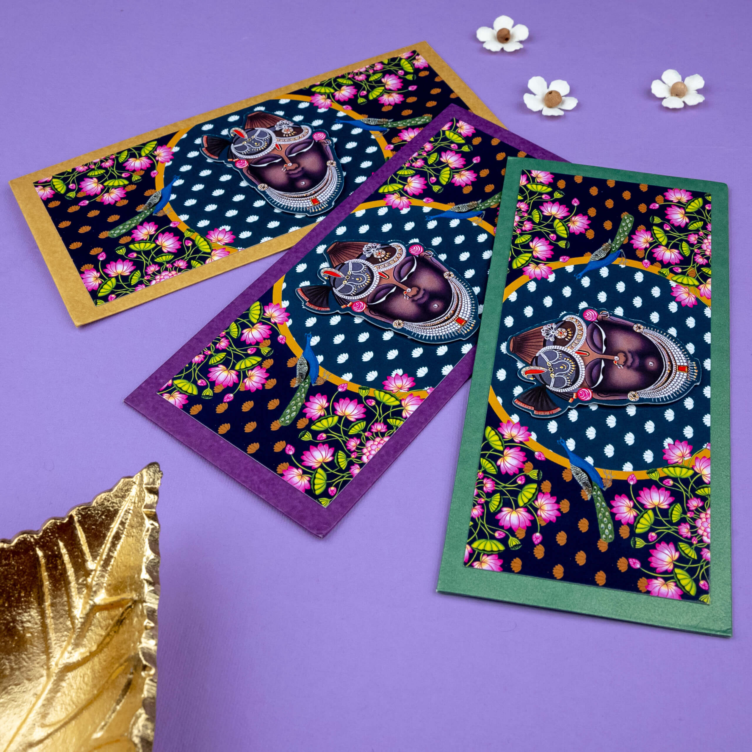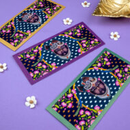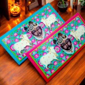 Celebrate the essence of devotion with these beautifully designed money envelopes, showcasing the serene face of Lord Krishna framed by vibrant lotus flowers and traditional patterns. The dark, rich background contrasts elegantly with the intricate detailing and bold colors, making these shagun lifafa envelopes ideal for weddings, festivals, and religious events. Crafted with premium quality and a touch of tradition, these envelopes offer a thoughtful and graceful way to present monetary gifts on auspicious occasions.