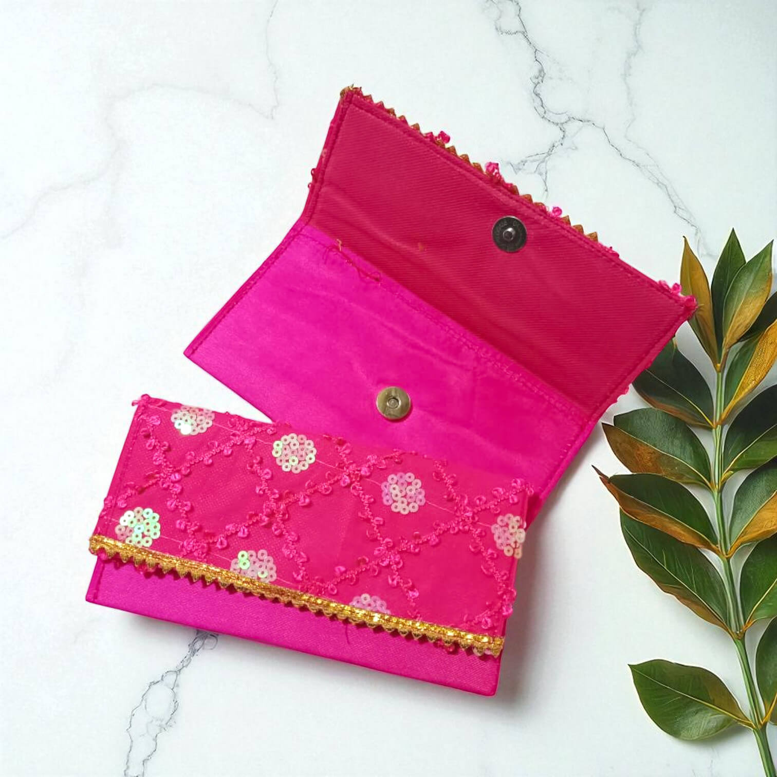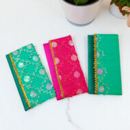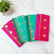 Add a pop of vibrant color and sparkle to your celebrations with these beautiful fabric envelope. Crafted from bright, high-quality silk, each envelope is adorned with a delicate geometric sequin pattern that catches the light. The striking color combination and elegant gold trim make them ideal for joyous occasions. Perfect for Mehendi, Sangeet, Rakhi, or any event where you need a festive, eye-catching presentation.